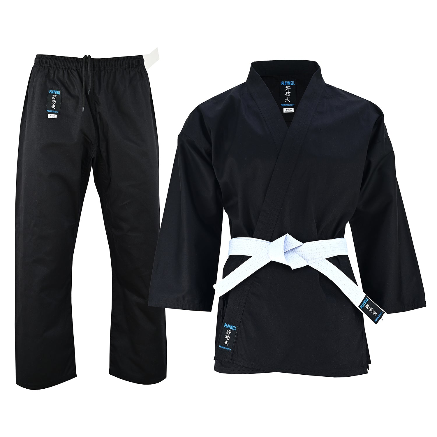 Karate Black Suits are Medium Weight 8oz and of top quality and designed for comfort fit to give you a greater range of movement. There is no other match to Playwell suits.
