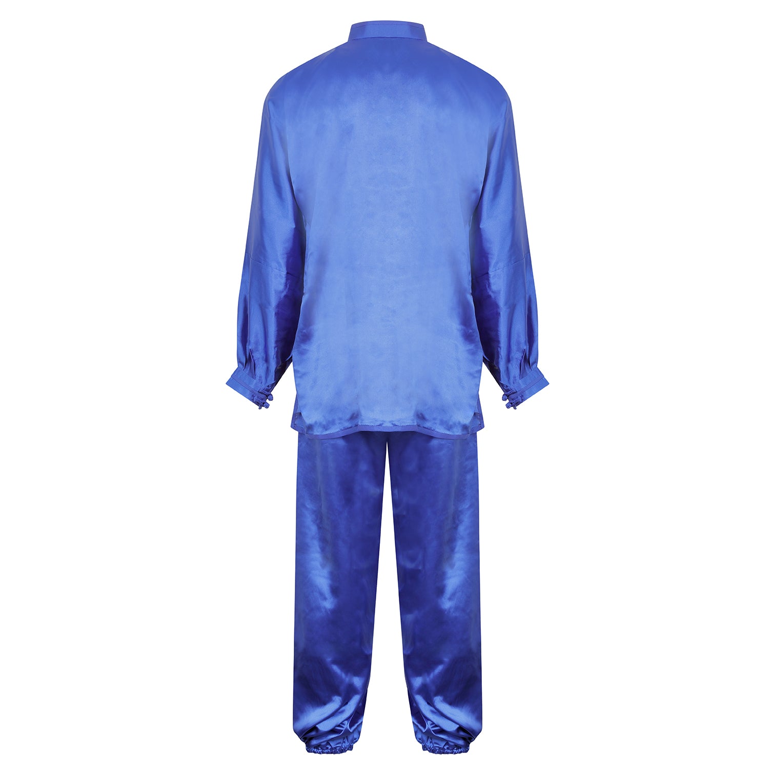 Tai Chi Silk Uniform - Blue - Made of 100% Genuine Silk. long sleeve uniform features frog buttons and mandarin collar. Pants have elastic waist and ankles. Loosefitting, Lightweight, Cool And comfortable.