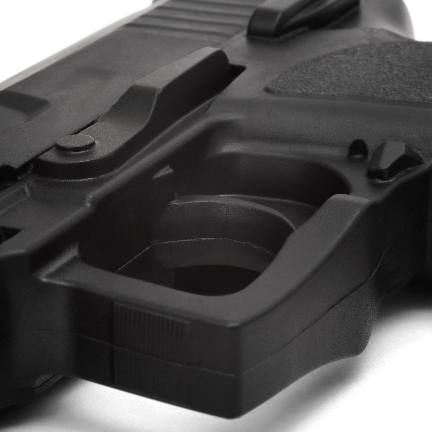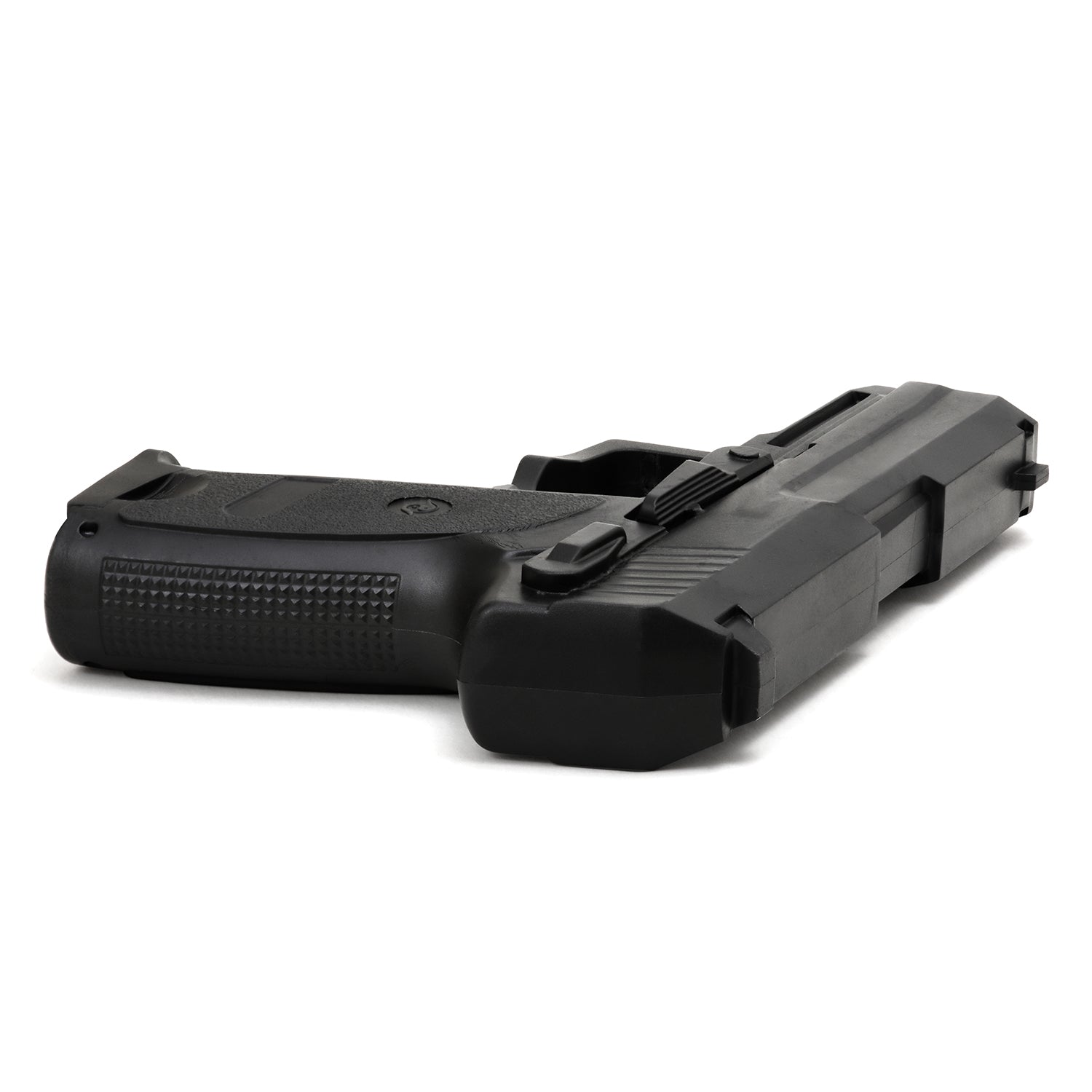 Black rubber hand gun replica with mock trigger. Realistic design by Playwell for use and training in method of non-deadly force. Measures: 7.5 inches in length and 5 inches width. Weighs 1 pound. Colour of the gun is subject to Black